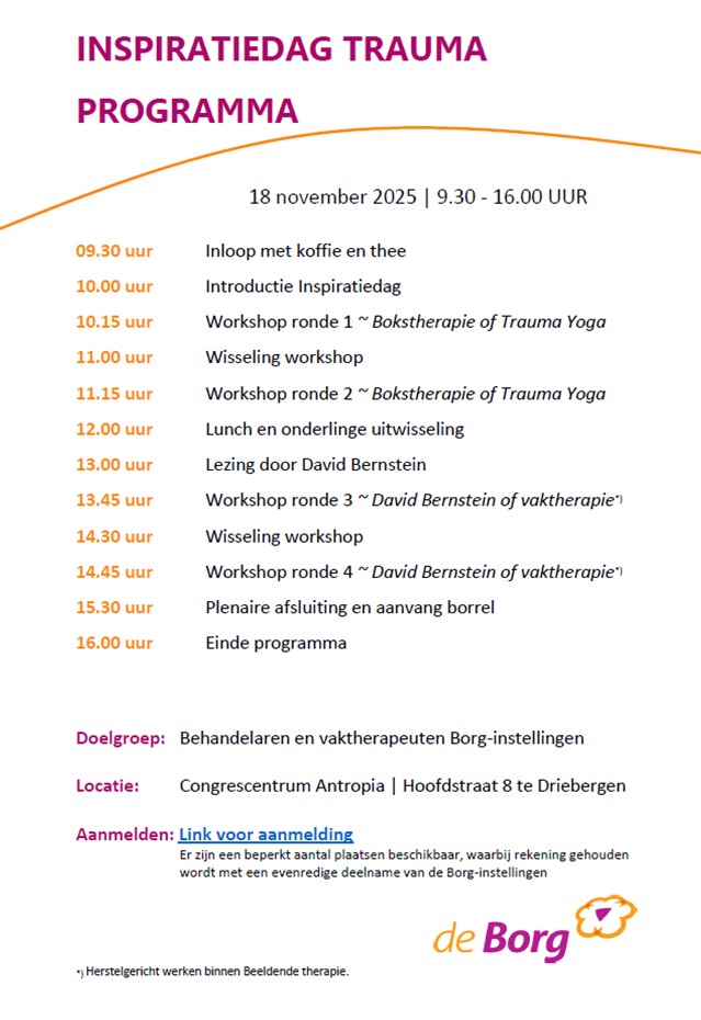 Deze inspiratiedag wordt georganiseerd voor behandelaren en vaktherapeuten van de Borg-instellingen*).